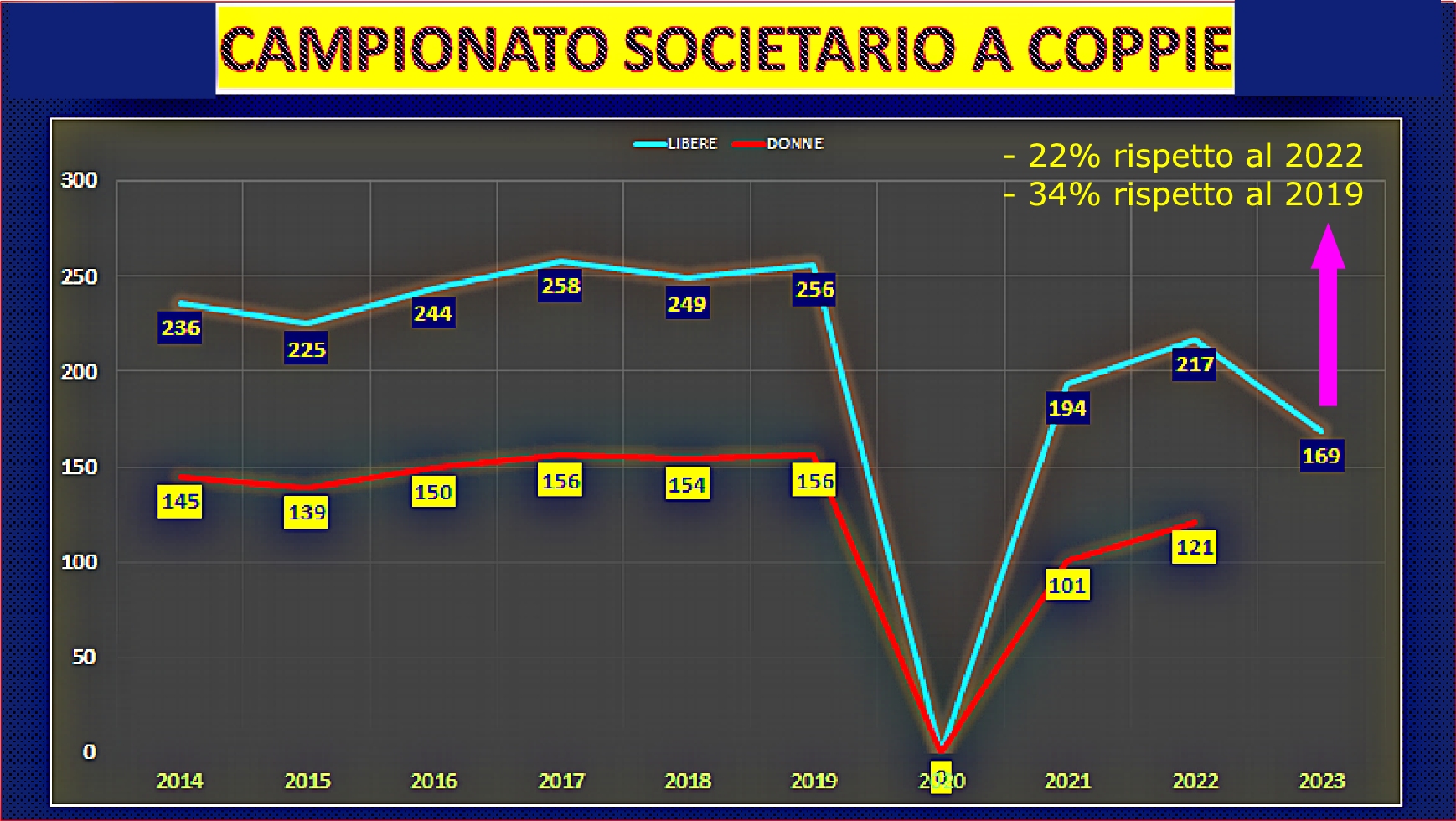 La partecipazione ai simultanei è pressoché analoga a quella del 2022. Rispetto al 2019 (pre-pandemia), si denota un calo di partecipazione intorno al 50%. In netto calo anche la partecipazione ai tornei online FIGB. | | Oltre all’elevato numero di simultanei – nel 2001 erano solo 12! - si devono aggiungere i numerosi Campionati e pernottamenti inutili a Salso e le ingiustificate gabelle verso arbitri e insegnanti. |
