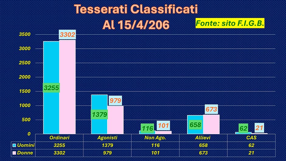 I dati, elaborati manualmente, si riferiscono ESCLUSIVAMENTE a tesserati CLASSIFICATI (Fonte: FIGB) | | Commento in merito al recente verbale della riunione di Consiglio Federale n. 17 del quadriennio 2021/2024, 29 novembre 2023 |
